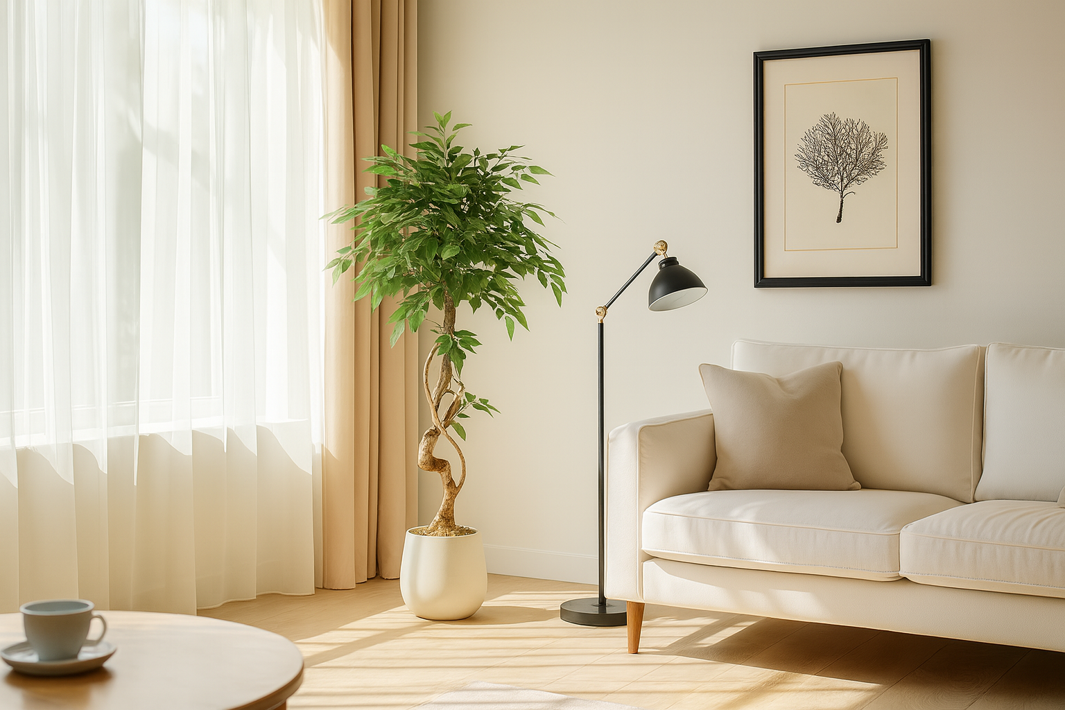 Artificial trees enhance the atmosphere in living rooms, hallways, work areas and studio layouts. They pair well with natural light, soft textiles and bright walls. Near a window the tree forms a green silhouette, while next to furniture it completes the composition. In larger rooms, two trees create symmetrical framing that highlights central zones.