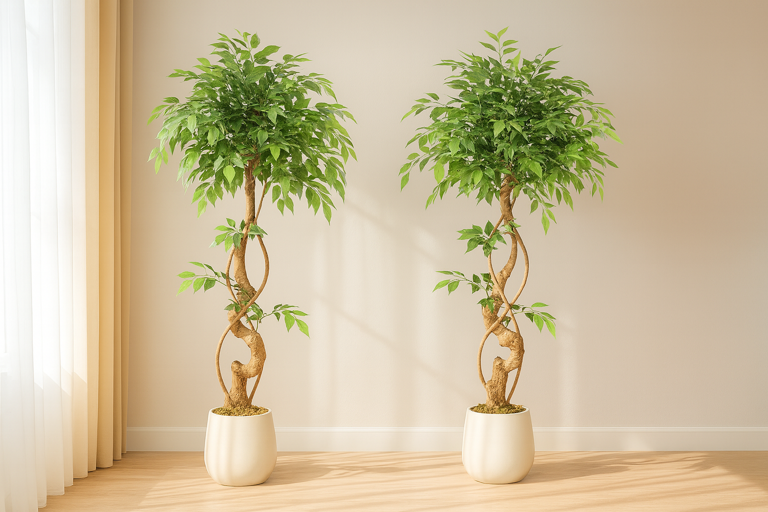Verdylith trees enrich interiors with natural shapes and light green tones. The full ficus crown reveals soft shades that shift throughout the day with natural lighting. The twisted trunk adds warmth and depth, blending with wooden floors and light textiles. This creates a harmonious composition in which the tree becomes part of the overall mood of the room.