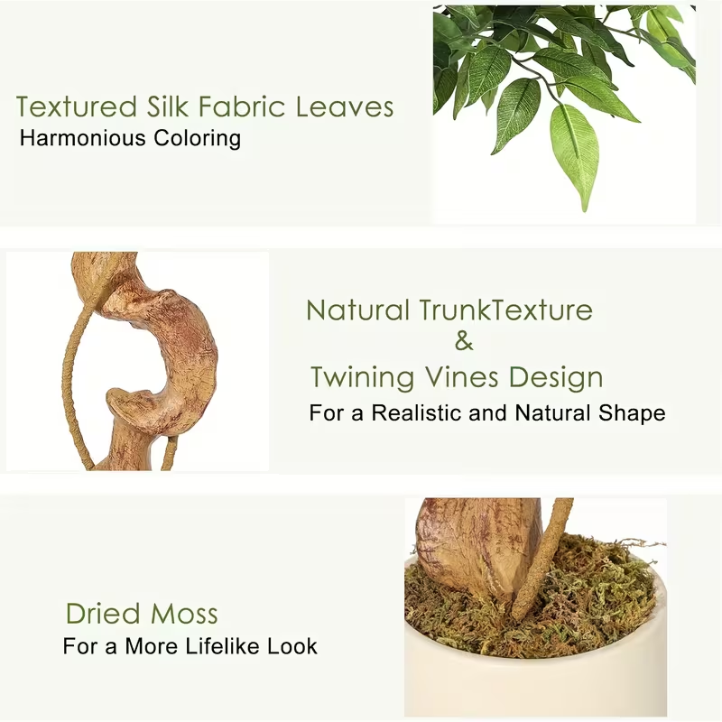 Care involves periodically cleaning the leaf surface and trunk. A soft, dry cloth works best for keeping the texture smooth and the crown fresh in appearance. The tree can be gently repositioned from time to time to refresh the room layout or highlight another corner. The pot has a stable shape, which helps the tree maintain balance wherever it stands.